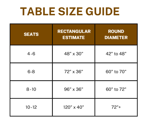 For seating, the rule of thumb is to allow 24″ of space per seat at your dining table. Most rectangular tables are between 30″ and 42″ wide. However, remember when working with live edge slabs they are unique in shape and size.